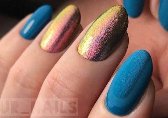 Ее использование широко распространилось благодаря тренду на «хромированные» ногти. Эффект зеркального покрытия повторить очень сложно, но изобретательные нейл-мастера нашли способ максимально приблизиться к желаемому результату – с помощью мельчайшей зеркальной пудры, которая похожа на звездную пыль.