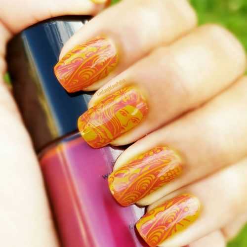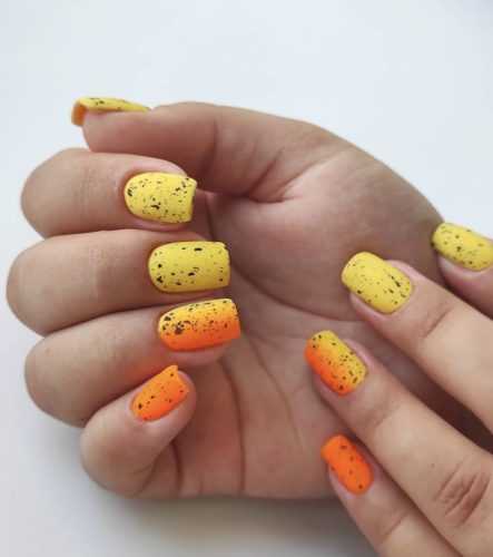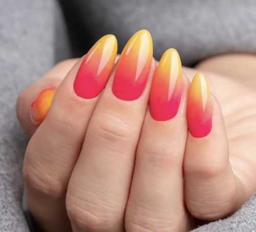 Замечательно выглядит лунный маникюр с сочетанием двух ярких оттенков цвета. Лунный маникюр — не новинка, он известен с 20-х годов ХХ века. Но в последнее время нейл-арт в этом стиле особенно популярен. Его особенность — окрашивание лунки ногтя в отличный от окраски остальной ногтевой пластины цвет. Окрашиваем лунку ногтя лаком золотистого цвета. А остальную часть ногтя, очень аккуратно, при помощи губки, покрываем красным. Финал — нанесение закрепляющего покрытия — и уникальный маникюр, которые по праву можно назвать настоящим нейл-артом, готов.