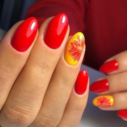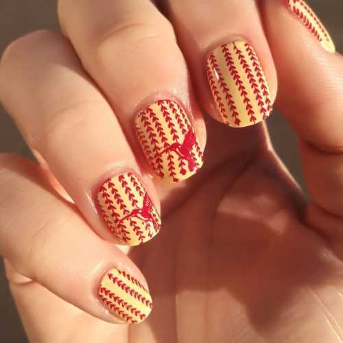 Красный лак в сочетании с золотым — не менее яркий и праздничный маникюр. Теперь попробуем продумать, как сделать неповторимый нейл-арт, использовав именно эти цвета