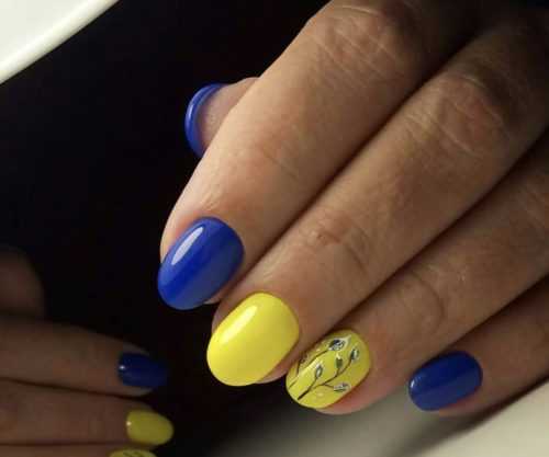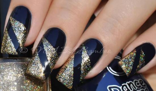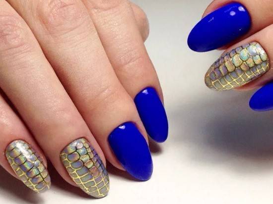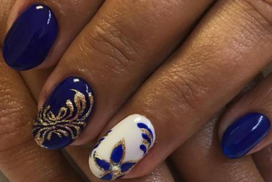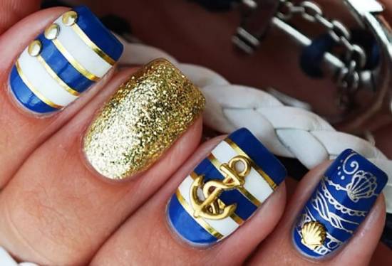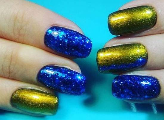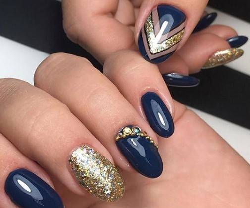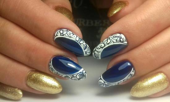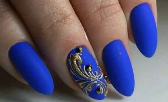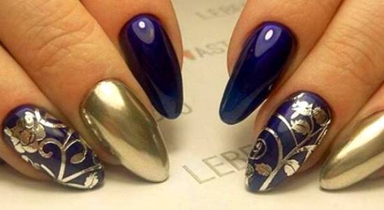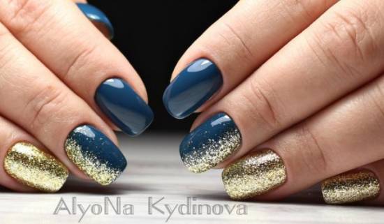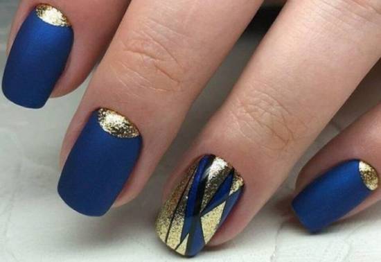 Дизайн ногтей в синем с золотистым акцентом является достаточно нетривиальным решением. На такой яркий нейл-арт решится не каждая, главное не переборщить. Синий с золотым уместно смотрится в маникюре для вечернего выхода. Варианты: