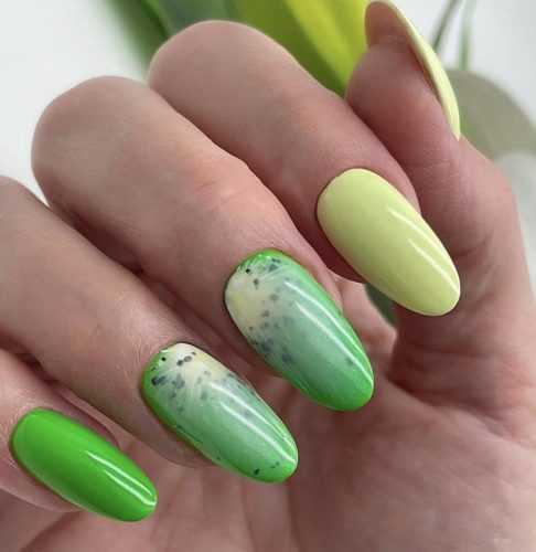 - Шиммеры – это лаки с мелкими сияющими частичками. Таким лаком можно накрасить все ногти сразу, и маникюр все равно будет выглядеть деликатно. Этими же лаками удобно расставлять акценты при создании сложного нейл-арта.