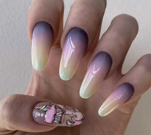 Вариант 3 – Переводная фольга. Переводная фольга для маникюра позволит получить радужный дизайн ногтей с фольгой. Для этого подготовьте пальчики, нанеся желаемый лак, после высыхания которого аккуратно приложите фольгу и распределите ее по форме ногтя с помощью апельсиновой палочки, остатки – удалите. Результат закрепите финишным покрытием.