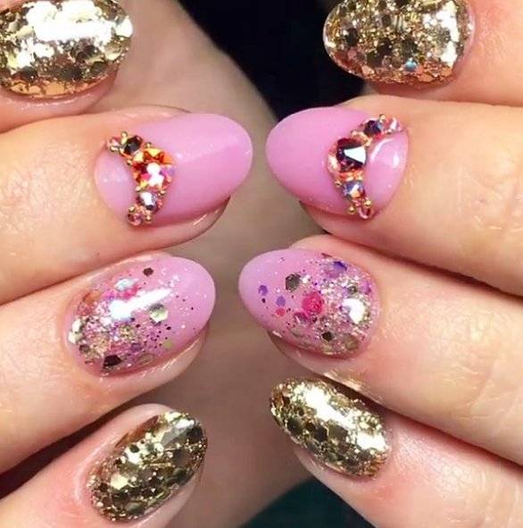 Золотой блеск придает ногтям настоящий шик. Если у вас есть немного свободного времени, обязательно попробуйте одну из представленных ярких идей.