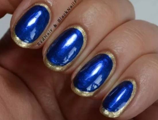- Использование в лунном маникюре. Также как и в сочетании красного с оттенком драгоценного металла, синим лаком покрывается вся ногтевая пластина, а металлическим исключительно лунка.