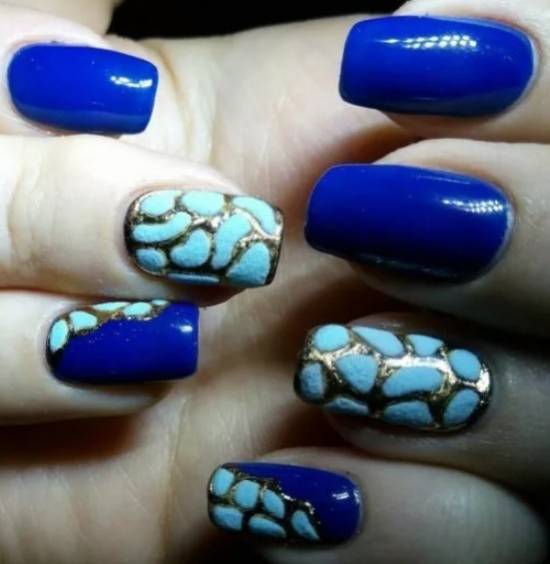 Красивый синий маникюр для смелых девушек — сочетание насыщенного цвета и анималистического принта.