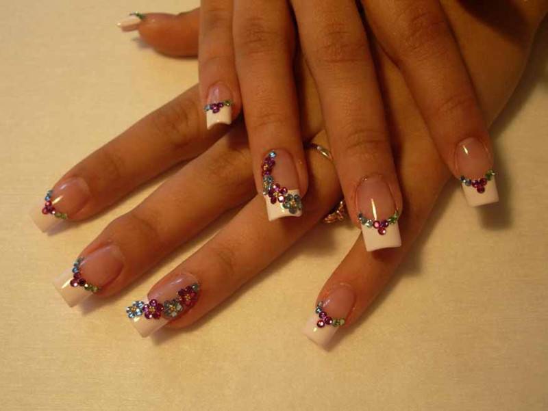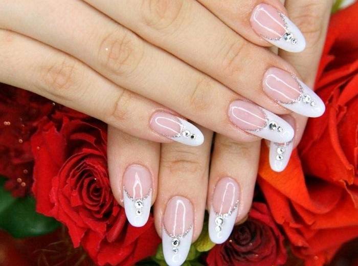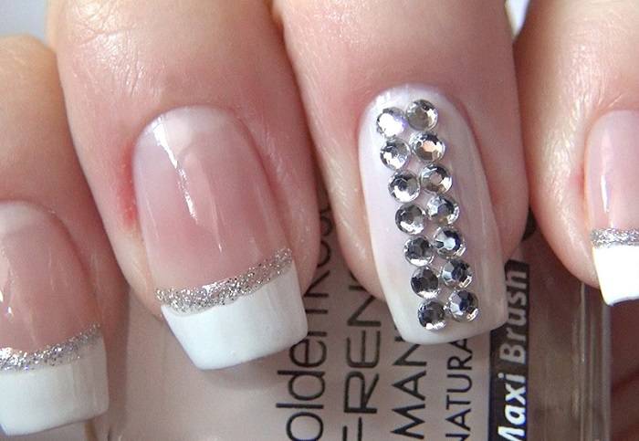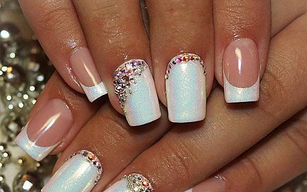 Очень элегантно смотрится на ногтях французский маникюр со стразами, особенно актуален этот дизайн на свадебное торжество. Стразами, как правило, подчеркивают линию френча либо сочетают французский маникюр с узорами, украшенными стразами.