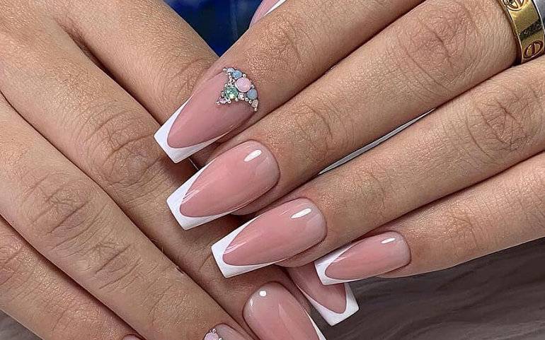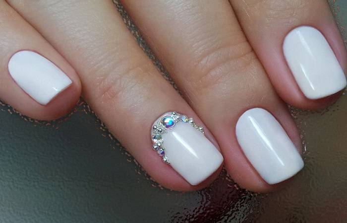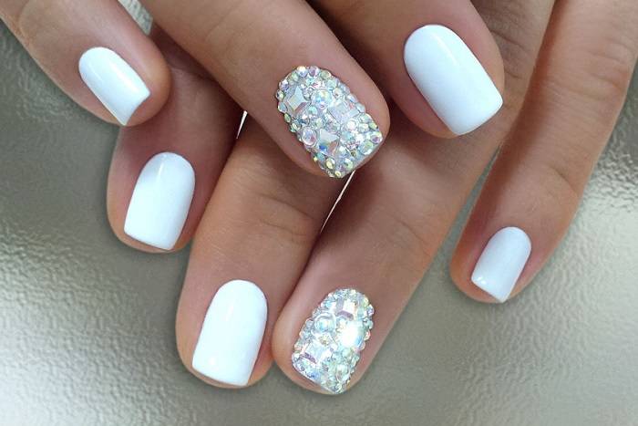 Популярностью среди девушек пользуется френч, украшенный стразами. Особый эффект придают стразы классическому французскому маникюру, выполненному в белом цвете.