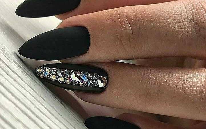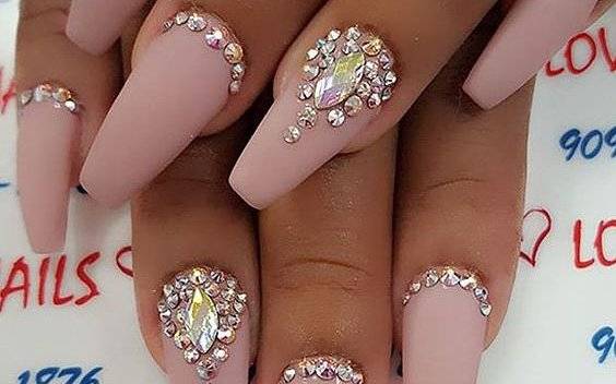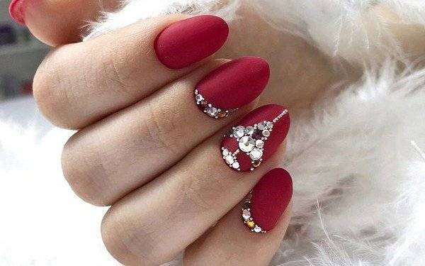 Шикарно выглядит инкрустация камнями матовых покрытий. Для спокойных, светлых, постельных цветов лака больше гармонирует блестящий декор.