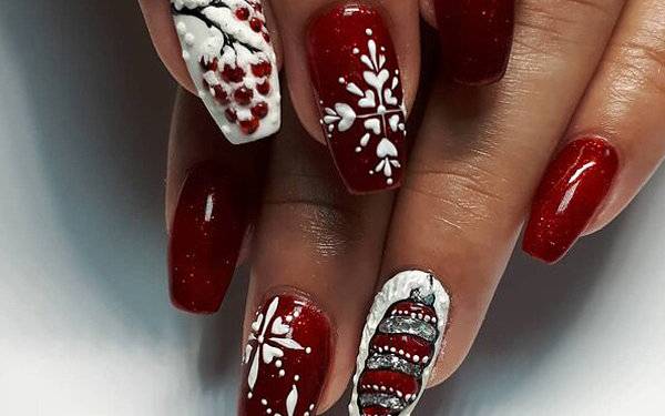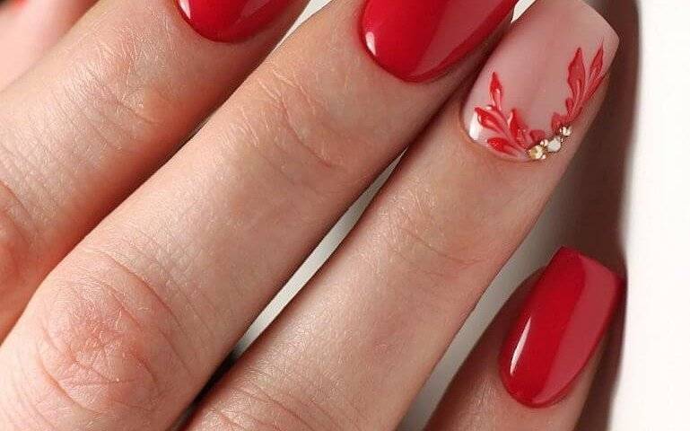 Красный цвет довольно часто используется для создания праздничного маникюра. Речь идет не об однотонном покрытии, а о рисунке. Это могут быть такие новогодние атрибуты, как елка, подарки, подходящие фразы и многое другое. Также можно сделать красный маникюр на день рождения. В таком случае тематическим рисунком может быть праздничный колпак, торт со свечками, поздравительные фразы и т.д. Главное — использовать стразы для дополнительной яркости маникюра.