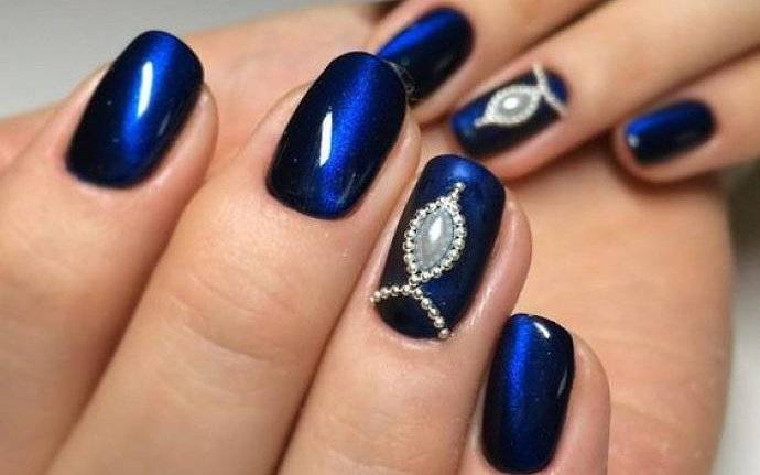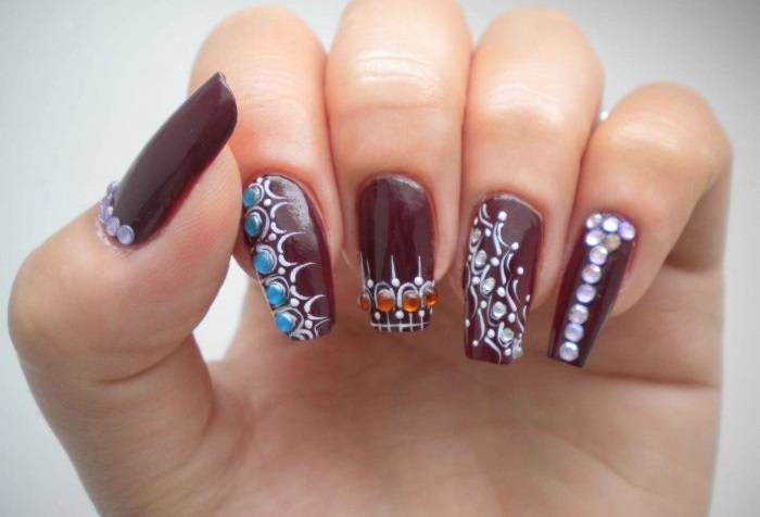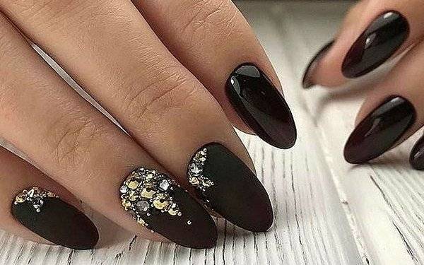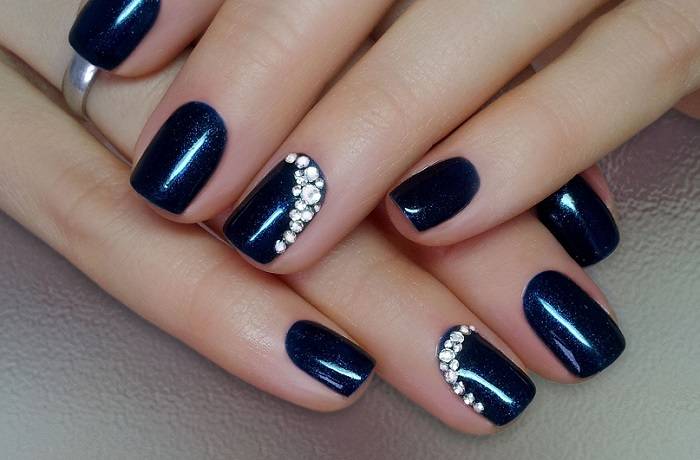 Помпезный и шикарный вид темным оттенкам лака придает декорирование ногтевых пластин блестящими стразами. Эффектно смотрятся камни на красном, бордовом, вишневом, синем, черном, зеленом, шоколадном фоне ногтевого покрытия.