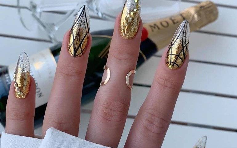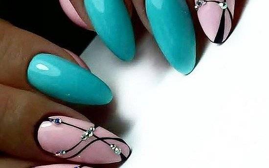 Любительницы сдержанного дизайна практически всегда выбирают геометрическое оформление. Линии разной толщины, фигуры, а также их сочетание может быть лаконичным и еле заметным или же крупным. Это зависит от выбранного цвета для нанесения рисунка, а также количества деталей. Немаловажную роль играет основной фон и наличие дополнительного декора. То есть это могут быть только стразы или же сочетание с фольгированными деталями.