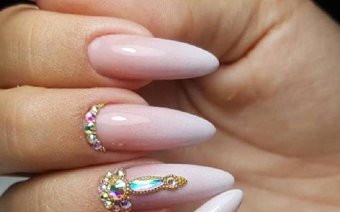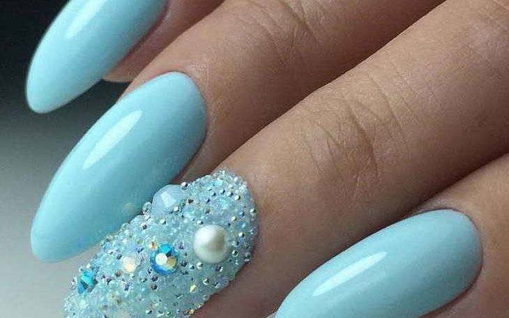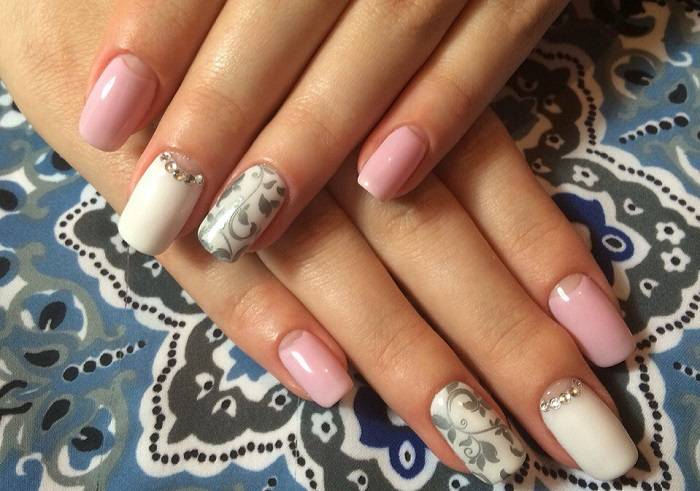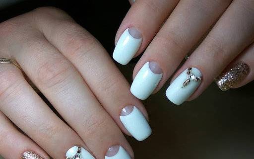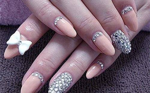 Прозрачные стразы выглядят восхитительно на нежно-розовом, персиковом, телесном, белом, голубом покрытии. Такой тандем придает рукам женщины утонченность и нежность.