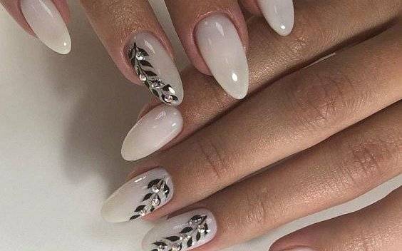 Не менее ярко выглядят нейтральные цвета ногтей, покрытые цветными камнями. Орнаментом из кристаллов принято украшать один из ноготков полностью или только его часть.