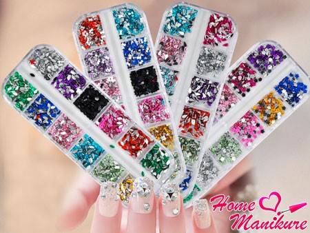 Стильные и модные нейл-арты можно создавать не только в салоне, но и в домашних условиях. Кристаллики разного цвета, формы и размера позволят вам воплотить в жизнь любой дизайн ногтей со стразами. Для этого вам необходимо приобрести специальные наборы декоративных камней. В любом ногтевом магазинчике продаются стеклянные или пластиковые стразы. Последние более дешевые, их проще клеить на ногти, но сверкают они не так ярко. На фото представлены красивые наборы разных цветов и формы.