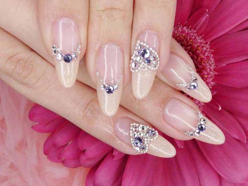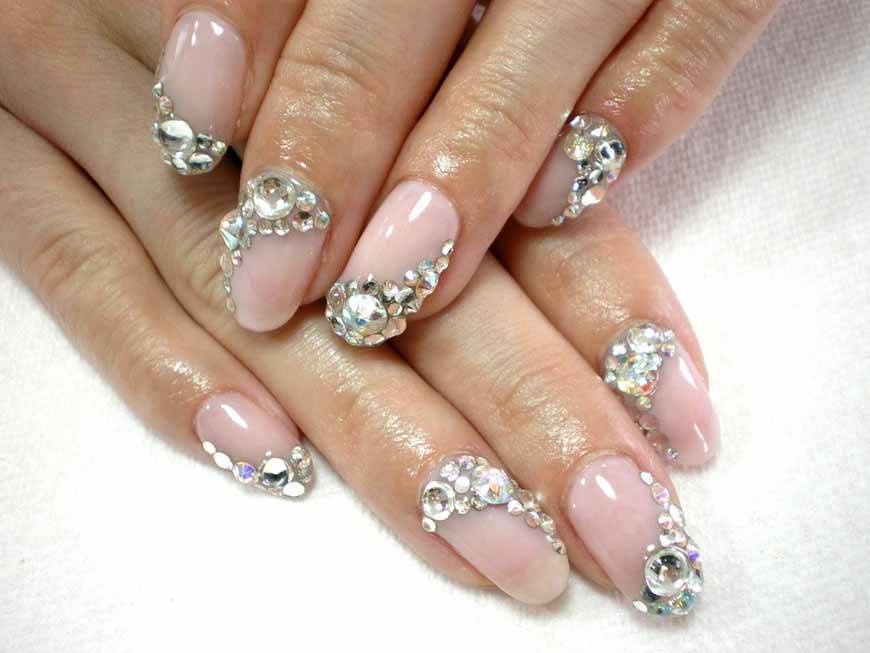 Прозрачные стразы выглядят восхитительно на нежно-розовом, персиковом, телесном, белом, голубом покрытии. Такой тандем придает рукам женщины утонченность и нежность.