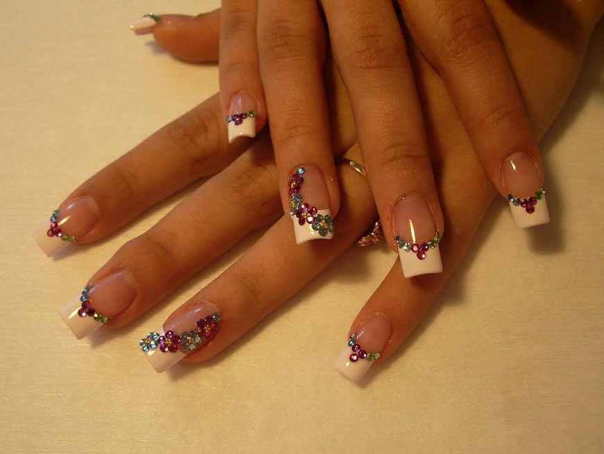 Очень элегантно смотрится на ногтях французский маникюр со стразами, особенно актуален этот дизайн на свадебное торжество. Стразами, как правило, подчеркивают линию френча либо сочетают французский маникюр с узорами, украшенными стразами.