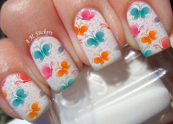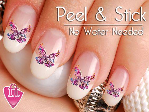 Если Вы не хотите заморачиваться с рисунками бабочек, есть прекрасное решение – готовые наклейки. Чтобы нанести их на ногти не потребуется много времени и сил. Просто накрасьте Ваши ноготки любым лаком и приклейте бабочек. Причем такие наклейки будут долго держаться, если сверху ноготки покрыть закрепляющим лаком.