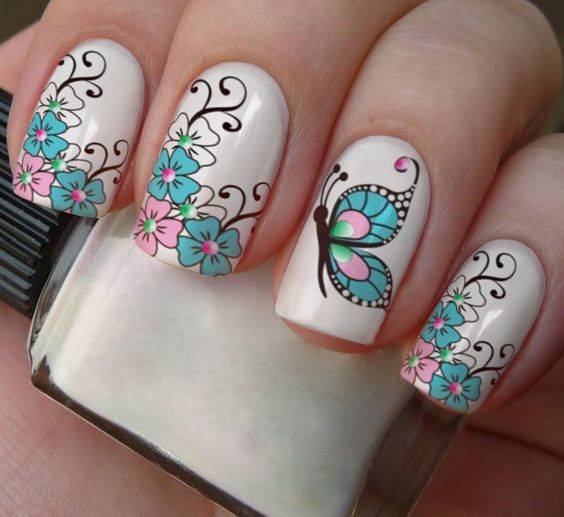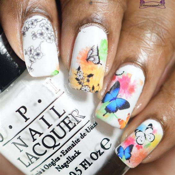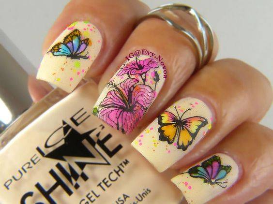 Бабочка роскошно смотрится только с пёстрой окраской, где присутствуют синий, зеленый, желтый, красный или оранжевый цвет. Если выбран синий или чёрный, то лучше использовать бледный общий тон. Так крылышки будут очень хорошо видны. Любые цвета лаков могут стать оттенками, даже если в природе бабочка и не имеет такого цветового сочетания в окрасе. Полет фантазии не должен ограничиваться, смело комбинируйте понравившиеся тона, применяйте их для выполнения узора.