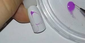 Не забывайте набирать лак на кисть перед тем, как выполняете каждую из частей рисунка. Для этого лист бумаги либо фольги лучше использовать в качестве палитры. Вылейте на нее немного лака, а флакон закройте, чтобы лак не засох и не загустел.