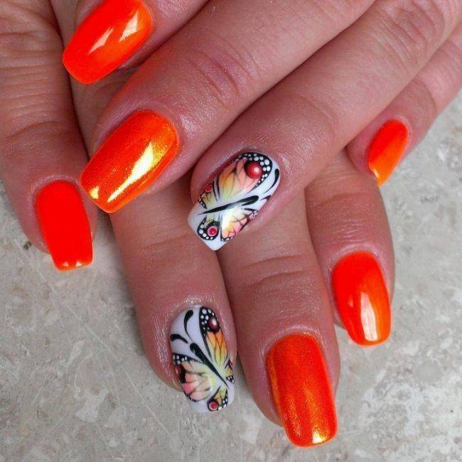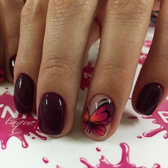 - Один ноготок можно не оформлять, а нарисовать на нем красивого мотылька.