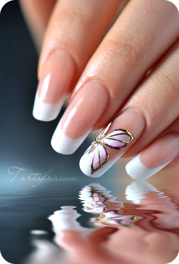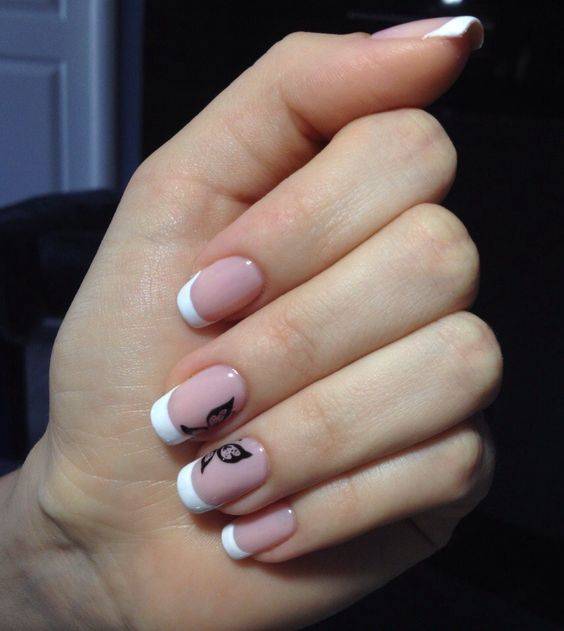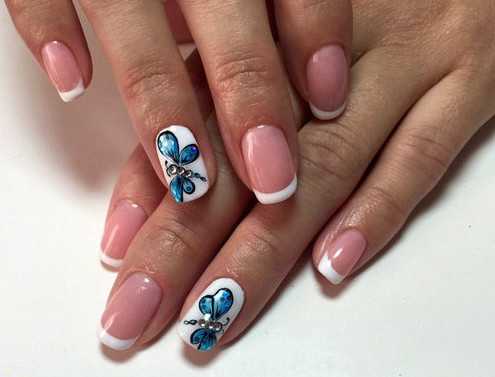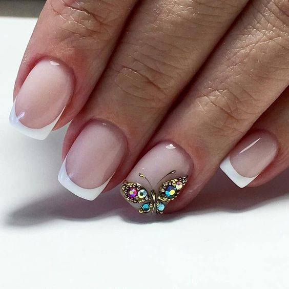 Французский маникюр – это настоящая классика, которая нравится большинству девушек. Френч с бабочками – это отличная идея разбавить классический материал. Именно эти изящные мотыльки придадут больше утонченности вашему образу. Классическая улыбка и нежная подложка прекрасно сочетаются с нежными крыльями.