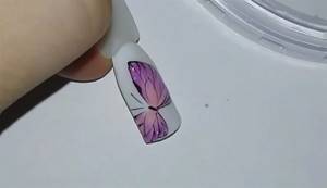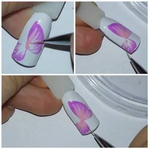 Следующим этапом является обрамление картинки. Обмакните тонкую кисточку в черный цвет и по контуру обведите крылышки. Далее необходимо нарисовать тонкие прожилки внутри, чтобы бабочки на ногтях смотрелись реалистичнее. На фото вы видите, какая картинка должна получиться.