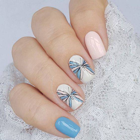Нейл-арт бабочки выполняется в несколько этапов и, как любой дизайн, начинается с нанесения базового покрытия. Для нежного маникюра лучше использовать мягкие приглушенные оттенки бежевого, голубого или розового тонов. Когда основа подсохнет, можно начинать рисовать бабочку. На палитру нанесите два цвета, например, белый и синий. Одним уголком плоской кисти захватите первый тон, другим – второй оттенок. На кончике окажется сразу два цвета. Нарисуйте на ногтях крылья бабочки, как это показано на фото.