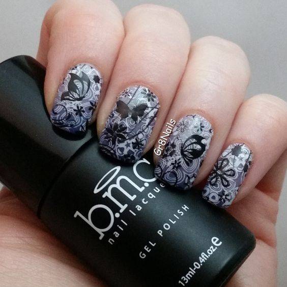 Стемпинг дизайн интересный принт чёрными бабочками на белом и серо-матовом фоне.