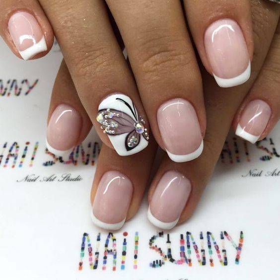 Белый френч с бабочками на ногтях средней длины овальной формы.