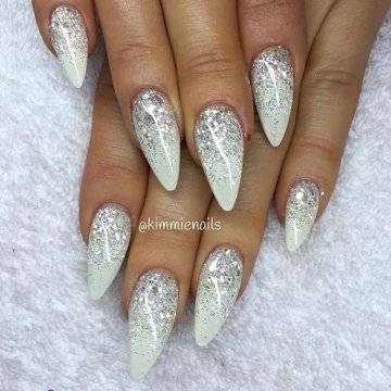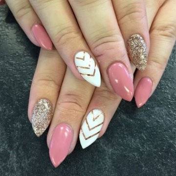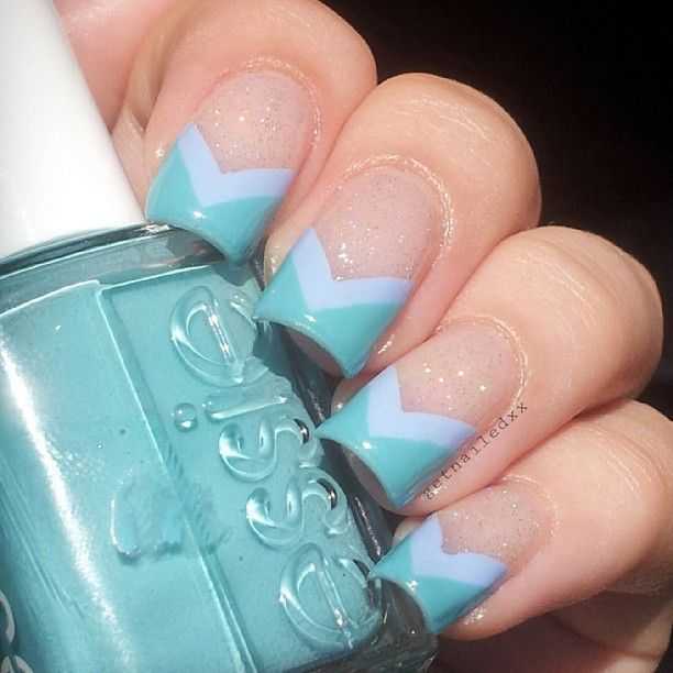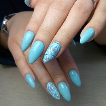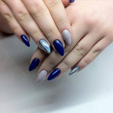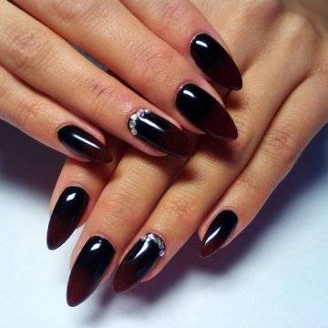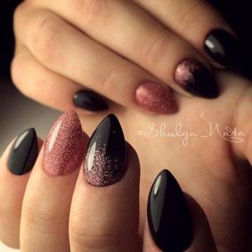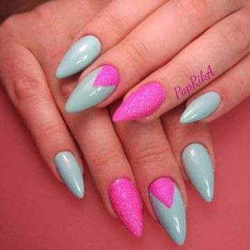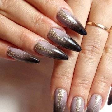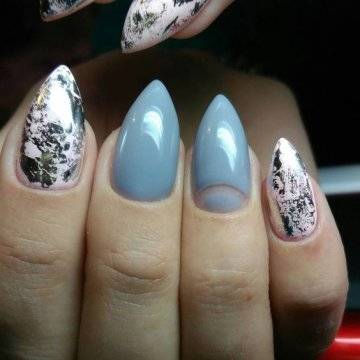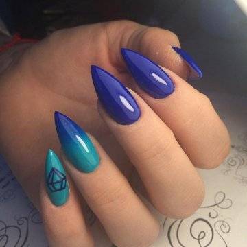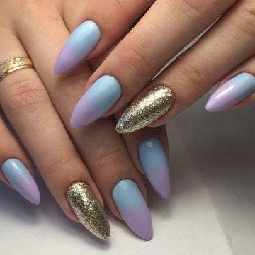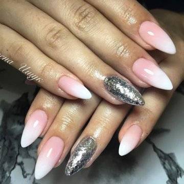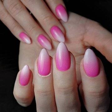 • градиент в нежных цветах – пресловутое омбре прекрасно смотрится на любой ногтевой форме, не исключением является и острая, особенно, если градиентный переход осуществляется от белого к нежно-голубому или светло-розовому оттенкам – такой маникюр придаёт изящества и благородства ручкам его обладательницы;