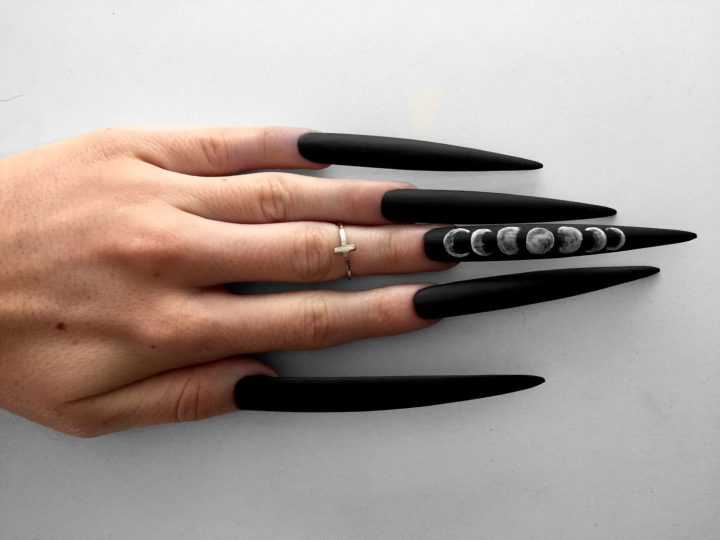Длинные ногти стилет матовые черные рисунок фазы луны.