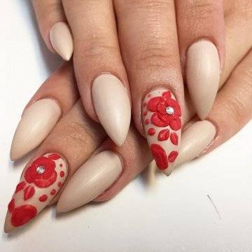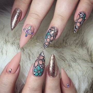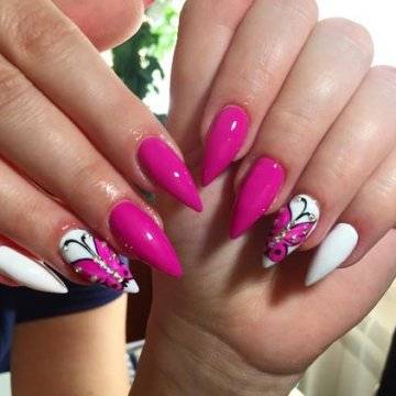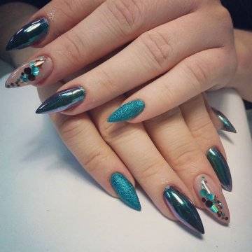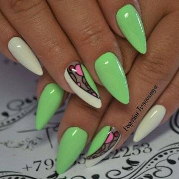 Острые узкие ногтит очень длинные, с красивым дизайном.