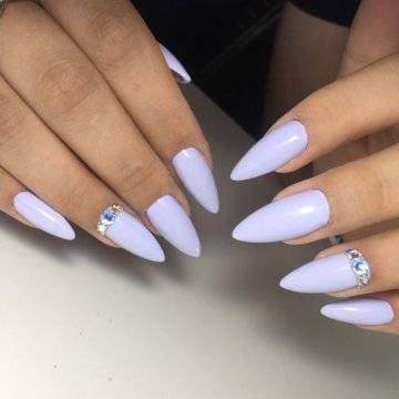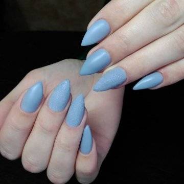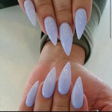Острые короткие ногти формы стилет, нежный голубой цвет.