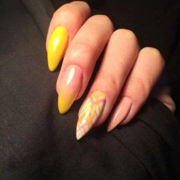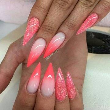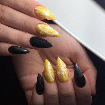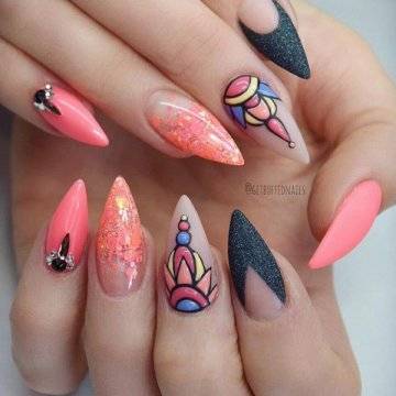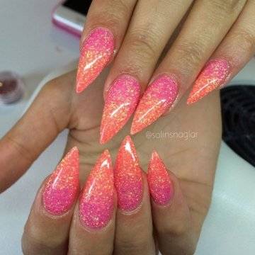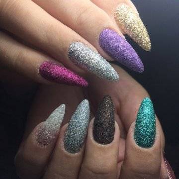 • дизайн «мармелад» на ногтях – очень необычное и интересное решение современного нейл-арта, самым искусным образом отражается именно на острой форме; осуществляется благодаря выбору нескольких ярких оттенков и присыпке его прозрачной песочной россыпью – смотрится стильно, модно, молодёжно;