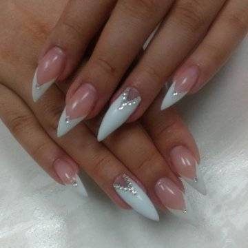 Френч на острых и очень длинных ногтях в форме стилет предназначен для особых случаев. Такой маникюр прекрасно и смело подчеркнет праздничный или вечерний лук. Острый френч стилет, декорированный блестками и стразами, выглядит своеобразно. А оригинальные рисунки на улыбке или френч ярко красного цвета, дополненный лепкой, привлекут взгляды окружающих. Замечательно и необычно выглядит френч на острых и очень длинных ногтях с рисунком на улыбке под названием «скрепка». Выполняется такой рисунок в основном в бело-черном цвете. Френч стилет выбирают смелые и уверенные в себе дамы, которые не бояться бросить вызов обществу.