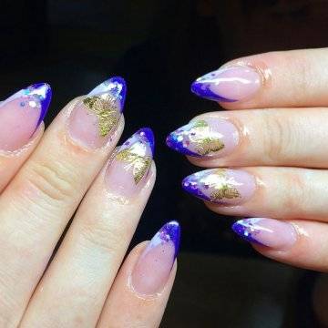 Интересное решение — синий френч со звериным акцентом. В качестве второго цвета выбирайте спокойные нюдовые, а переход оформляйте фольгой — золотой или серебряной.