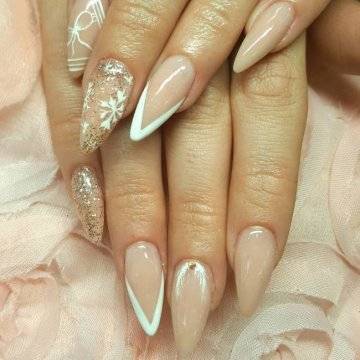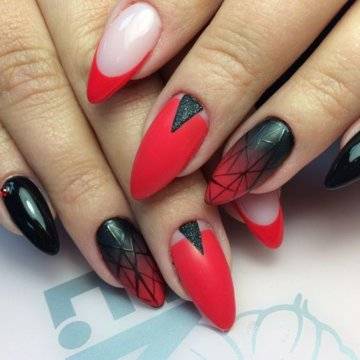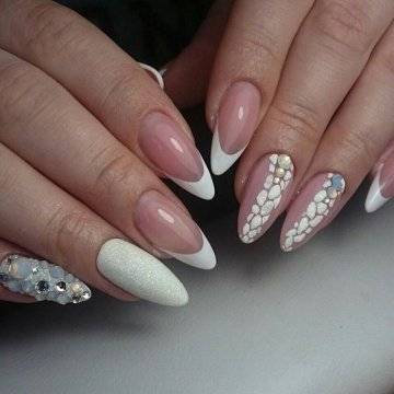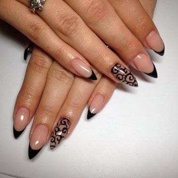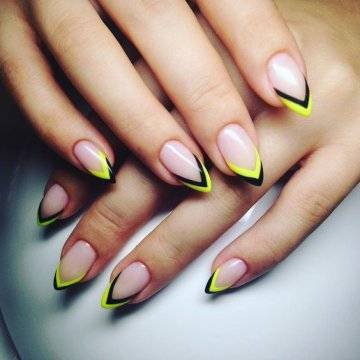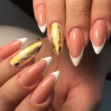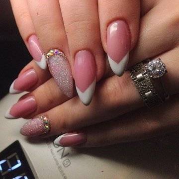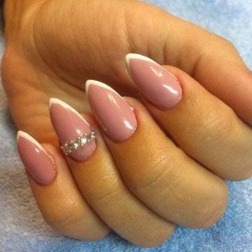 • классический «острый» френч на короткие ногти – нежность и благородство нестареющего французского маникюра способны скрасить вызывающую агрессивную яркость острых ноготков, тем более, если их длина укорочена;