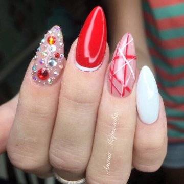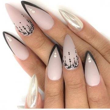 Красивые ногти формы стилет, комбинированный дизайн, рисунок кружево и стразы.