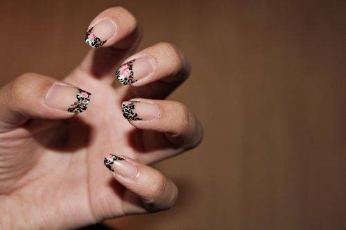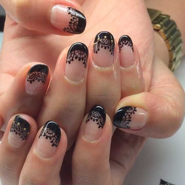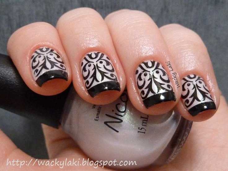 Не очень длинные ногти, черный френч, с белым рисунком на черном френче.