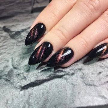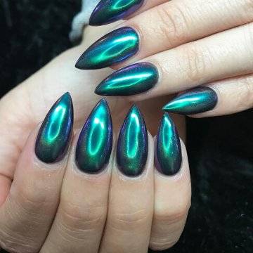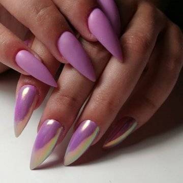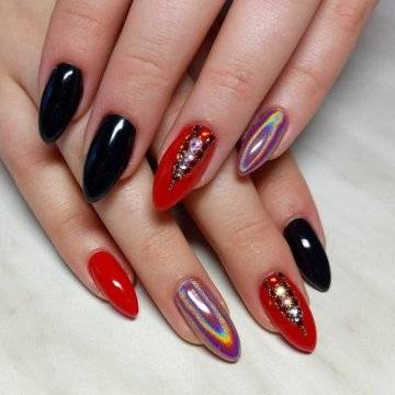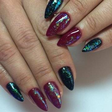 Острые ногти формы стилет покрыты гель лаком голографик, и черный гель лак.