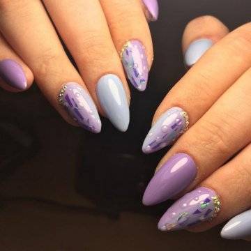 Ногти форма стилетмраморный дизайн, стразы и блестки.