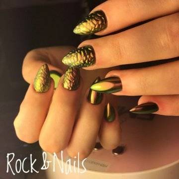 Роскошные ногти формы стилет украшены стразами, принт рептилия, блестки.