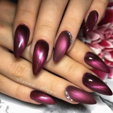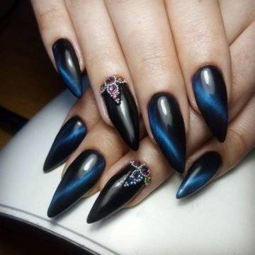 Стразы, лак кошачий глаз, на ногтях стилет.