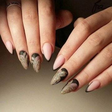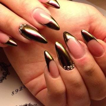 • фиксация декорирующего материала на искусственно смоделированном кончике – фокусировки всеобщего внимания на острых кончиках можно добиться зеркальным эффектом, фольгой, аквариумом или тёмным рисунком, выполненными исключительно от линии улыбки френча до самого кончика ноготка; при прозрачной нюдовой основе ногтя такой дизайн в любой цветовой гамме будет смотреться завораживающе и притягательно.