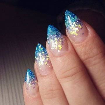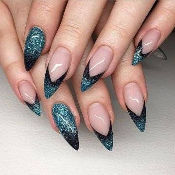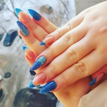 Ногти форма стилет длинные острые, френч с синими блестками.