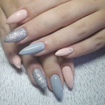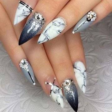 Длинные ногти острые, серый тон, мелкие капельки акриловый лак, серые блески.