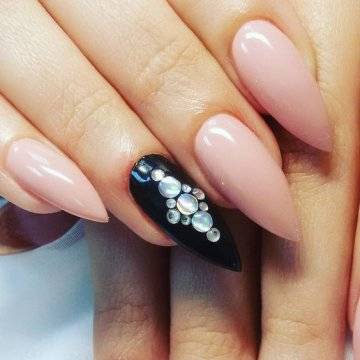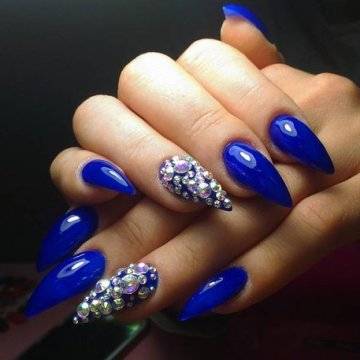 Нарощенные ногти форма стилет с большим количеством страз на одном ногте.