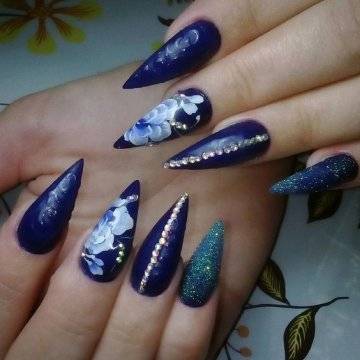 Красивые ногти стилет, роспись голубые цветы, стразы.