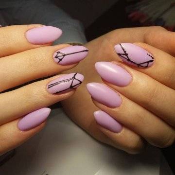 Геометрический дизайн – очень эффектный вариант, который прекрасно смотрится на длинных ноготках. В качестве дополнения можно украсить несколько ногтей блестящими элементами или строгими линиями. Таким образом вы подчеркнете разнообразность фактур.