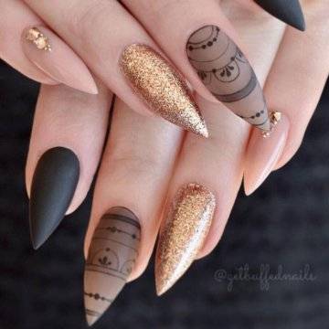Ногти длинные, острые матовые ногти, черный гель лак, интересный дизайн.